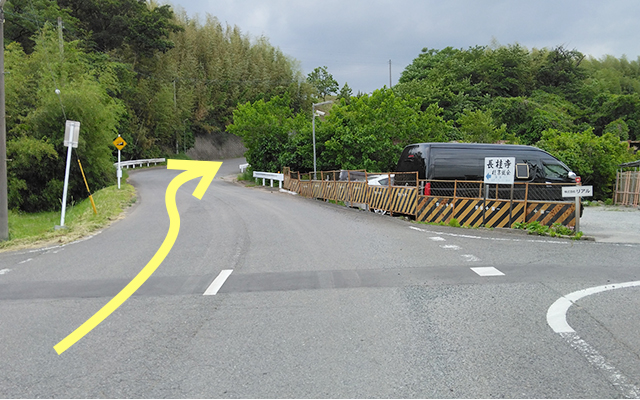 ↓ 長桂寺の案内看板が右手に見えたら、県道を左折して約550メートル進みます。